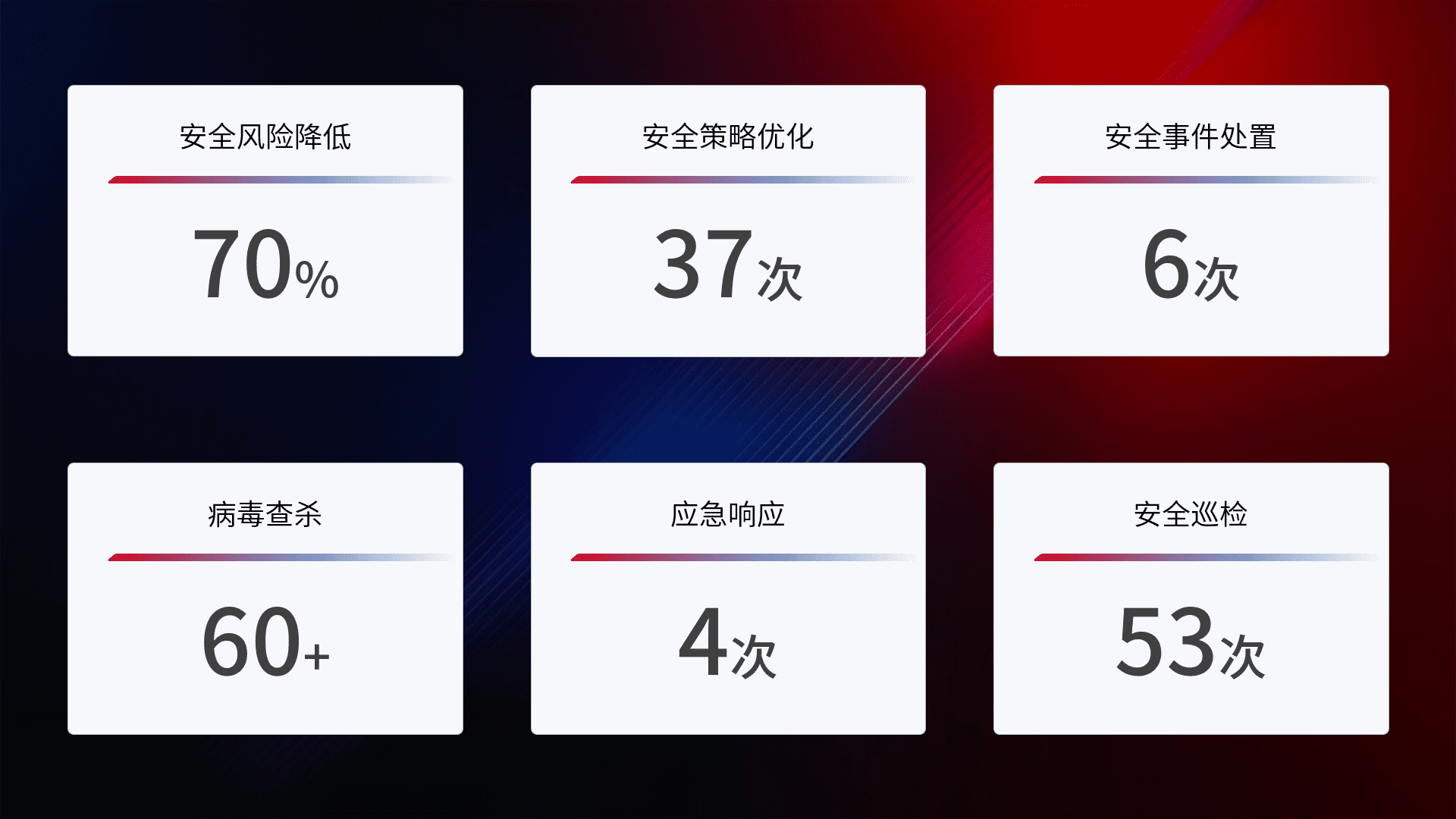 提供全面的安全事件报告体系,,包括处置报告、、、、周报、、、季度和年度总结,,,,结合持续监控,,帮助客户深入了解网络安全状况。。。。